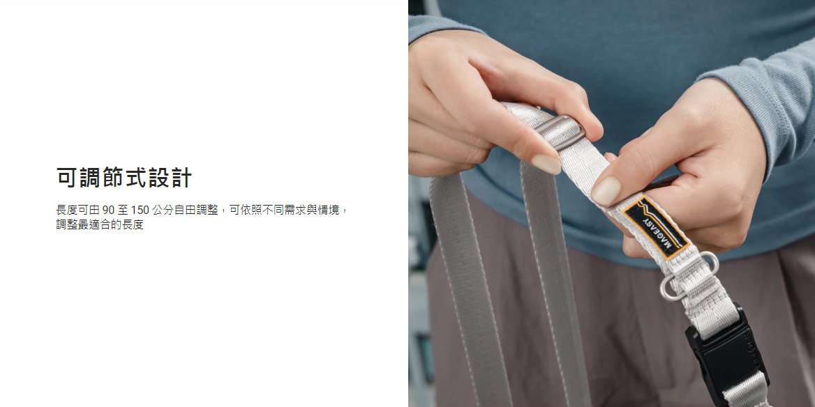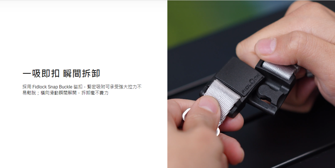 採用 Fidlock Snap Buckle 磁扣,緊密吸附可承受強大拉力不易鬆脫;橫向滑動瞬間解開,拆卸毫不費力