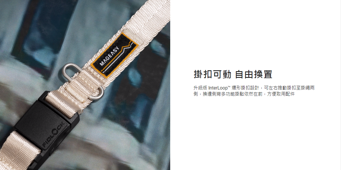 升級版 InterLoop™ 環形掛扣設計,可左右推動掛扣至掛繩兩側,換邊側背多功能掛點依然在前,方便取用配件