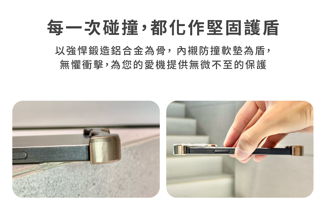 • 鋁合金骨架搭配防撞軟墊,強悍守護,無懼衝擊。