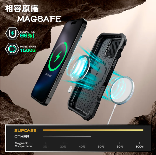 ● 背板 N52 強力磁鐵,支援 MagSafe 磁吸,確保配件緊密吸付磁性支架,並支援無線充電