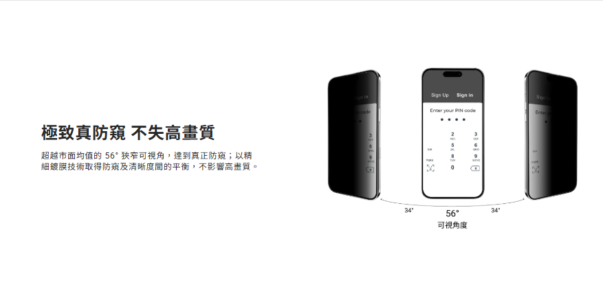 ● 極致真防窺 不失高畫質:超越市面均值的 56° 狹窄可視角,達到真正防窺;以精細鍍膜技術取得防窺及清晰度間的平衡,不影響高畫質