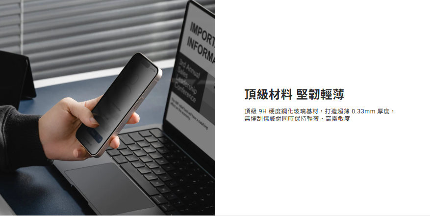 ● 頂級材料 堅韌輕薄:頂級 9H 硬度鋼化玻璃基材,打造超薄 0.33mm 厚度,無懼刮傷威脅同時保持輕薄、高靈敏度