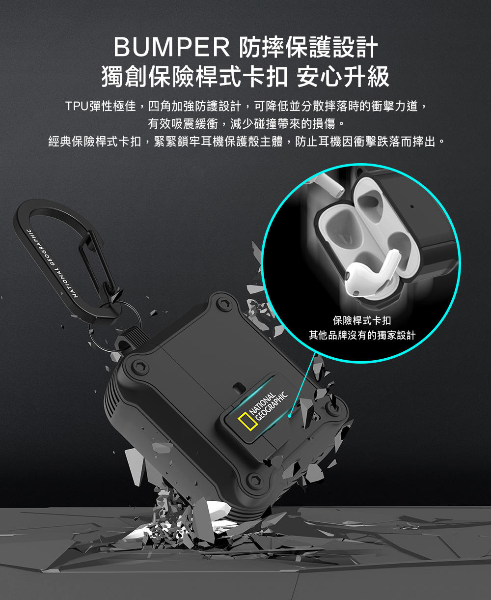 • 獨創保險桿式卡扣安心升級,唯有按壓鎖扣下方才能開蓋,不必擔心耳機丟失