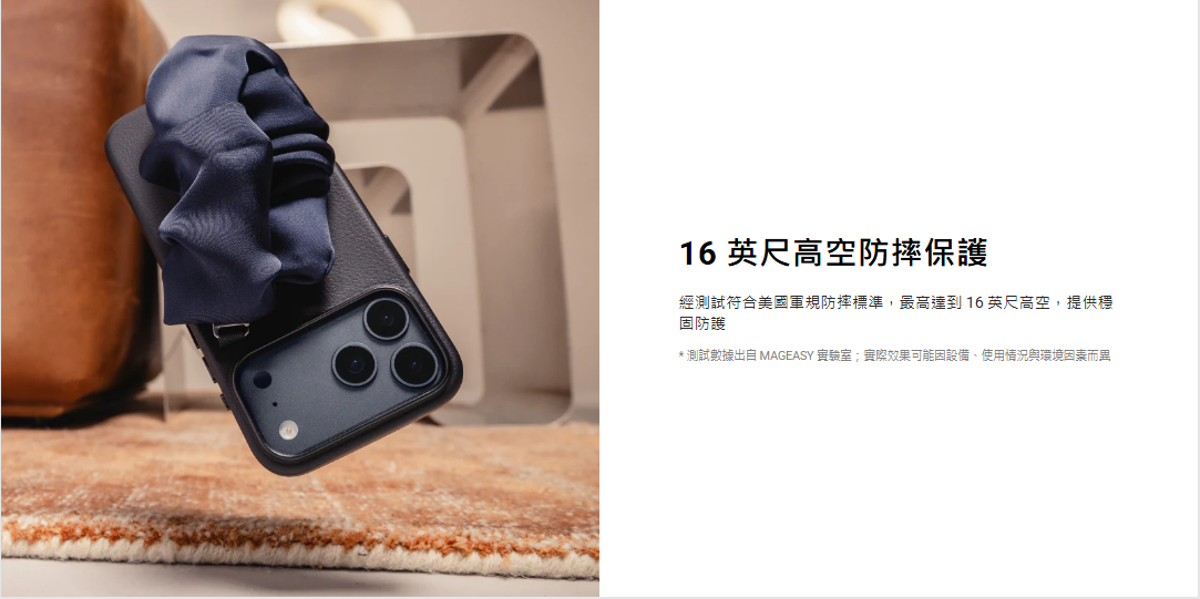 16 英尺防摔保護: 通過美國軍規測試,最高可達 16 英尺高空防摔。