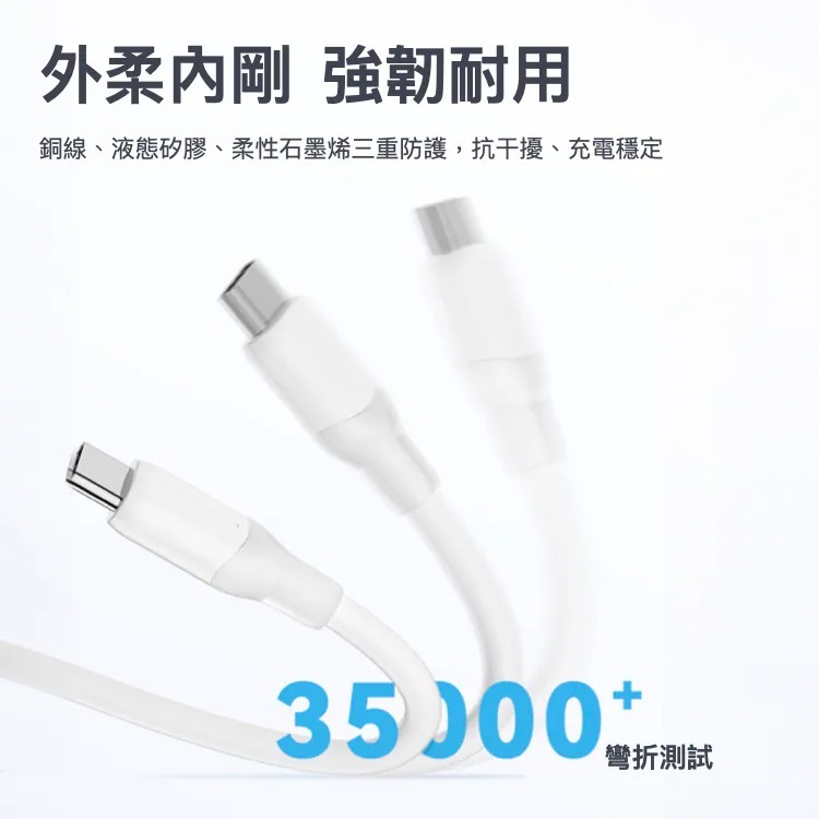 具有銅線、柔性石墨烯和矽膠的三層設計,比普通充電線耐用 25 倍,實驗室測試,線材具有20KG的抗拉強度和35000次的彎曲壽命