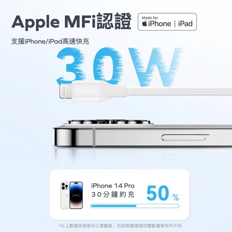 與20W或更高功率的電源轉換器時,能為iPhone 15或以下機型進行快速充電,可在 30 分鐘內充電至 50%