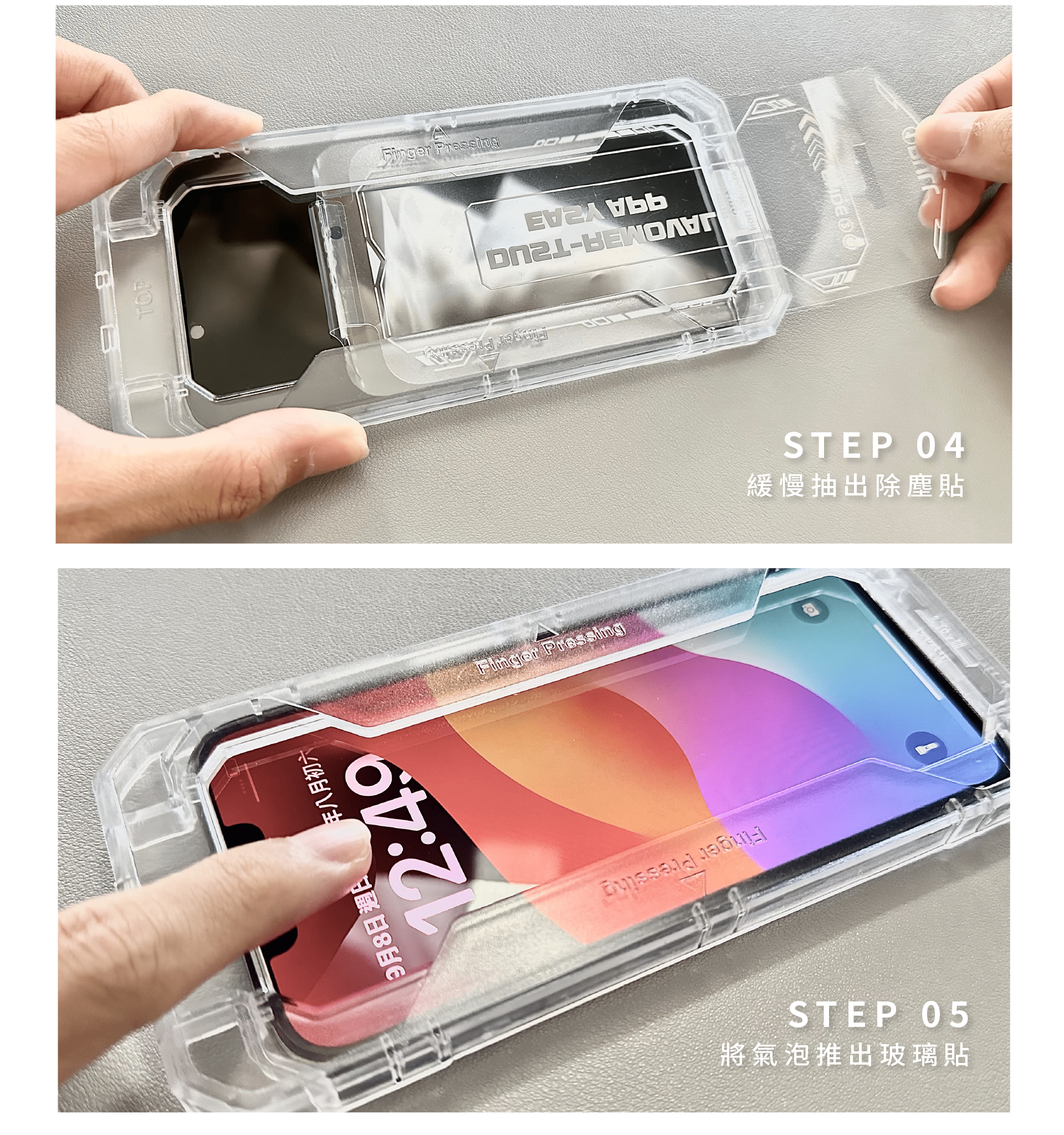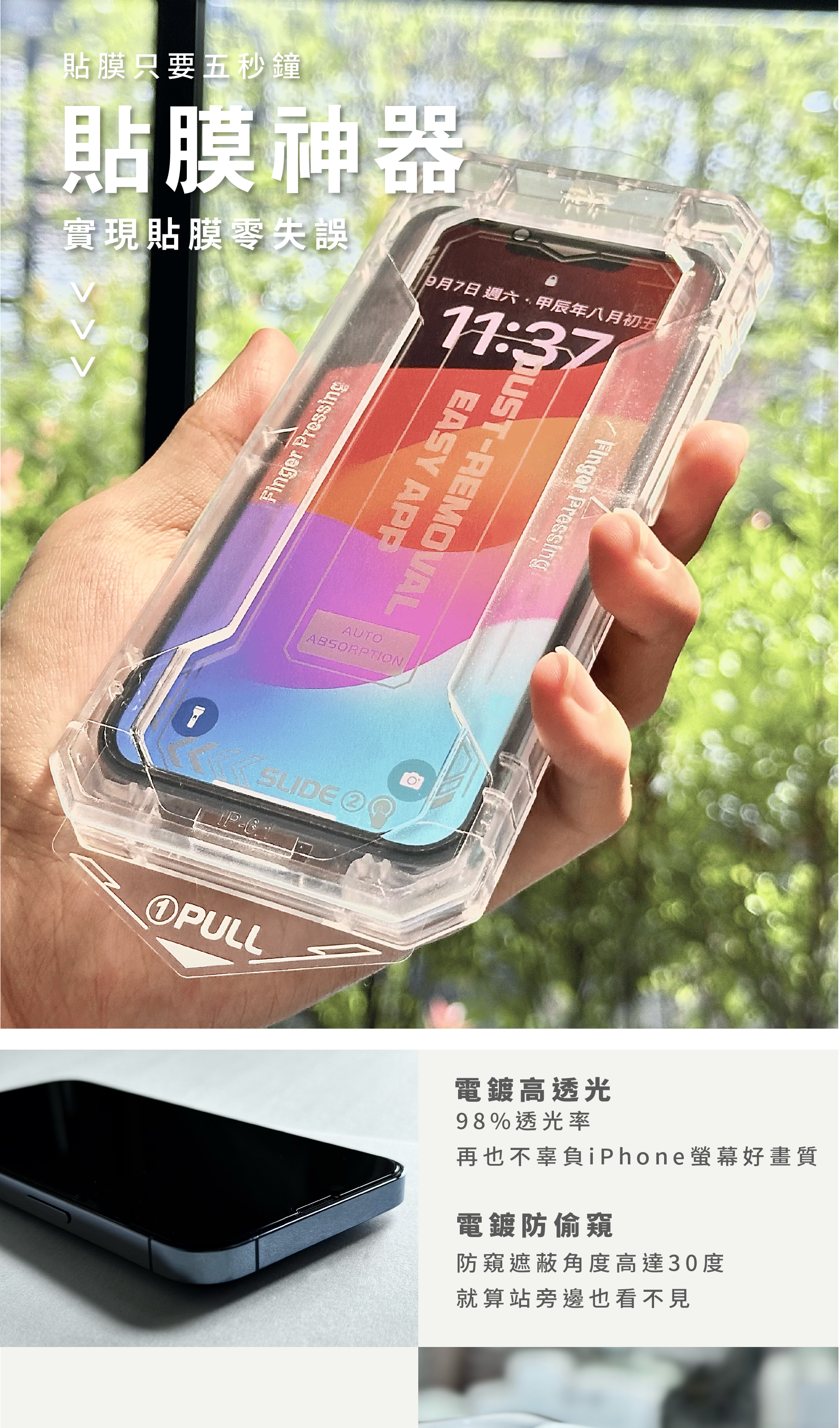 •無需技術經驗,只需將手機放入工具中,按照指示進行即可輕鬆完成,大大減少傳統貼膜所需之時間。